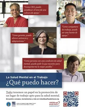 Freshen up bulletin boards in workplaces, service centers, educational institutions, places of worship or anywhere (including company intranets) by displaying the “Mental Health at Work: What Can I Do?” poster today! Order printed posters, or download and print a PDF of the poster in either English or Spanish by selecting from the images below. Questions? Please contact info@whatcanyoudocampaign.org.