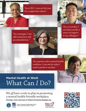 Display the Campaign for Disability Employment’s “Mental Health at Work: What Can I Do?” poster to emphasize the roles we all play in creating a mental health-friendly workplace.
