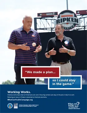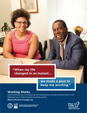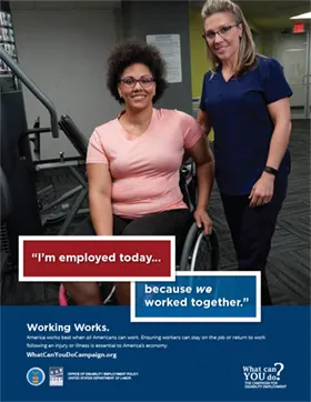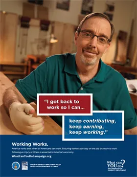Display the Campaign for Disability Employment’s “Working Works” Poster Series to emphasize the value of work and important roles that individuals, employers and healthcare professionals play in helping people stay at or return to work following injury or illness.
